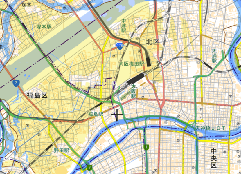 上記図の黄色部分は湿地帯を示しています。見てみると、大阪市北区全域が湿地帯であったことがわかります。